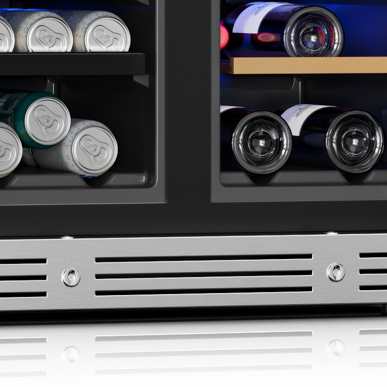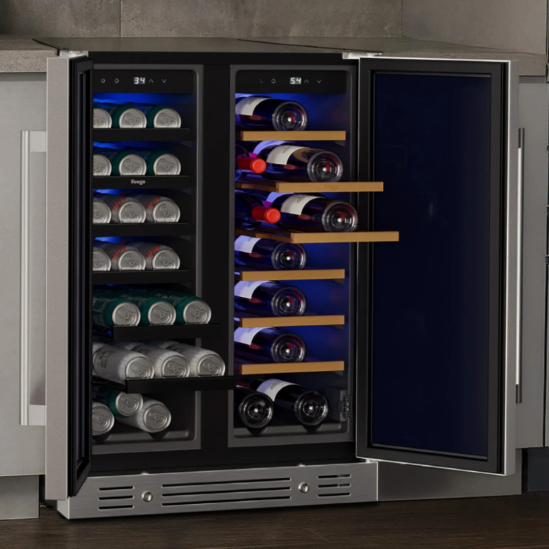 Two independent zones keep wine and beverages at their perfect temperatures—from 34°F–65°F. Dual evaporators deliver precise, stable cooling without temperature crossover. Store 20 Bottles & 60 Cans in One Compact Unit