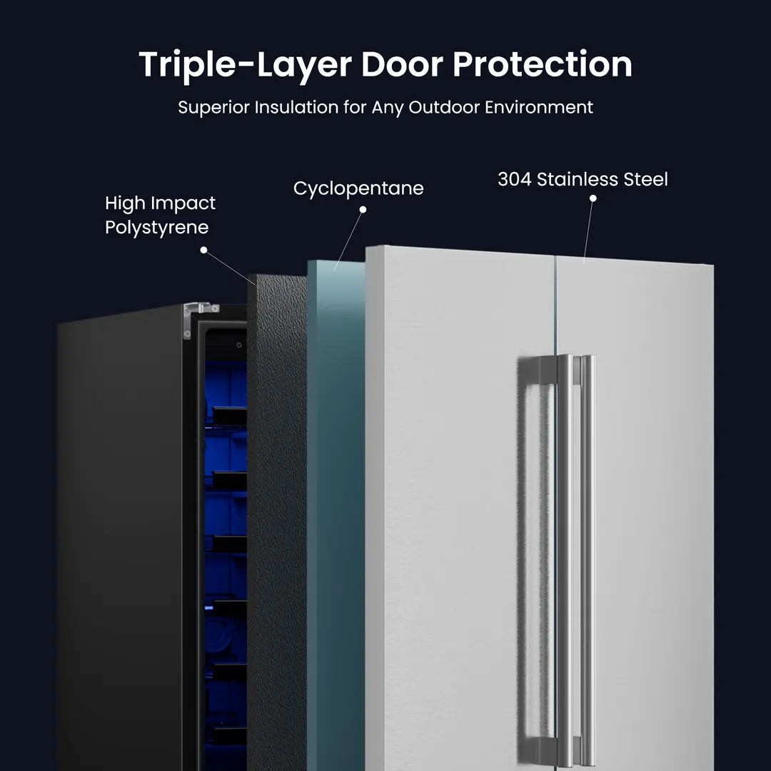 The durable, UV-resistant door helps maintain consistent cooling while blocking heat and sunlight—ideal for patios and outdoor bars. Energy Efficient & Quiet