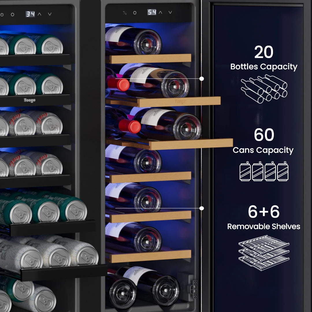 Designed for true entertainers, the Yeego 24'' Outdoor Wine & Beverage Fridge holds up to 18 standard bottles plus 2 larger ones and 60 cans of beer, soda, or sparkling water. With six wooden-trimmed wine shelves and six adjustable metal racks, you can organize your collection just the way you like. Whether you’re hosting a dinner party or relaxing by the grill, everything you need is perfectly chilled and within reach.
