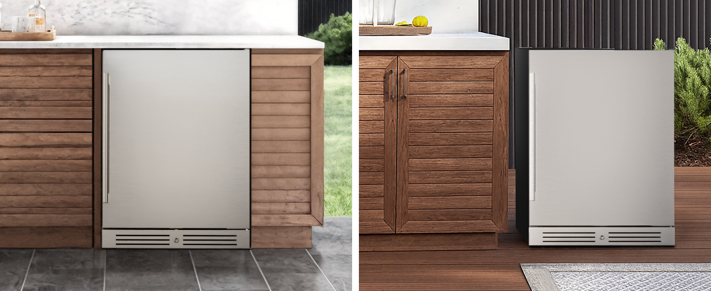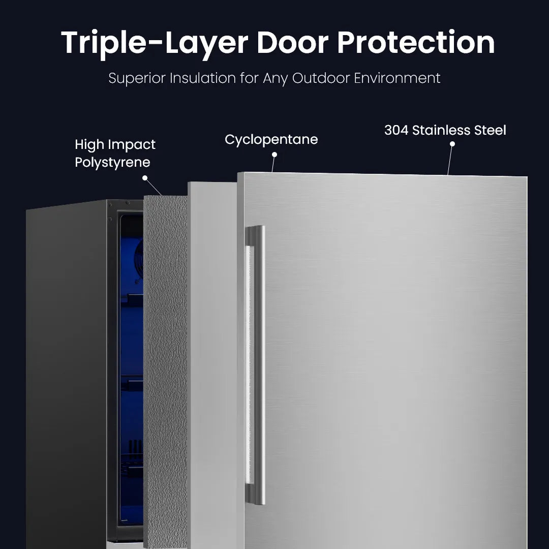 Yes. This Fridge is built for outdoor performance. Its triple-layer insulated door and stainless steel body protect against heat—making it ideal for patios, decks, and BBQ areas.