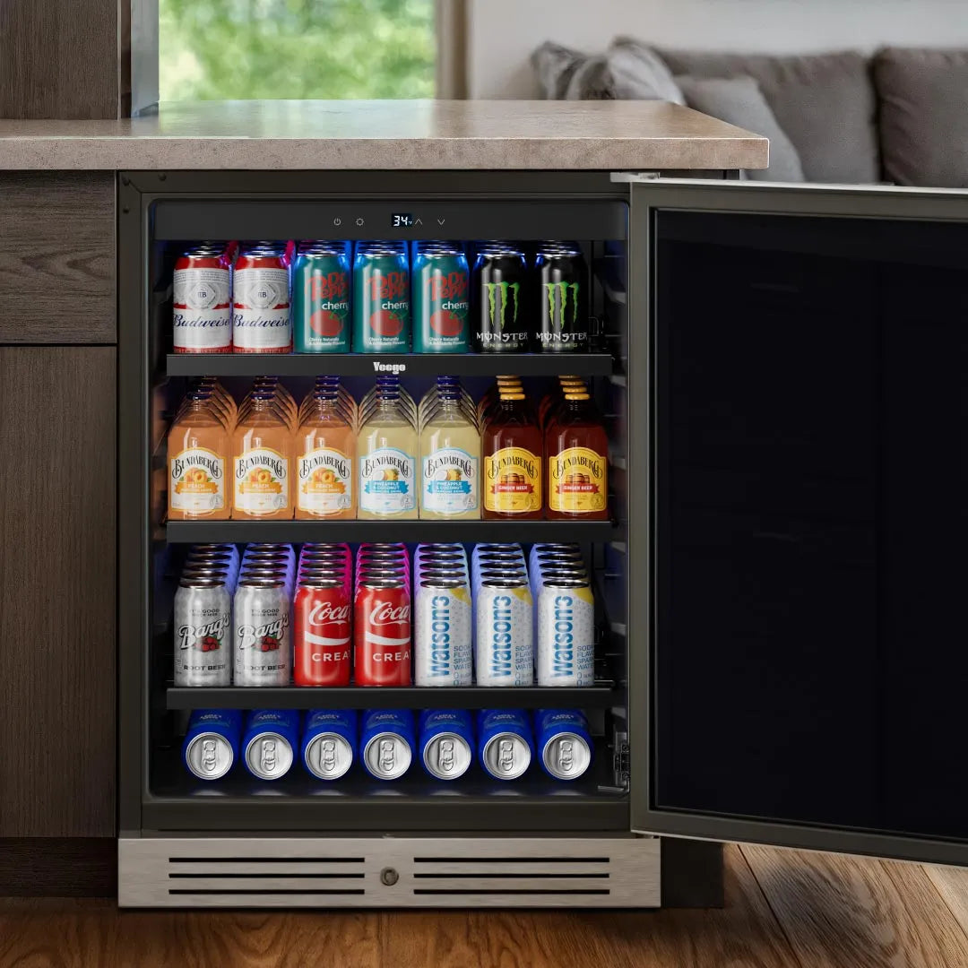 Upgraded compressor technology chills drinks quickly and keeps temperature steady between 34°F–54°F—perfect for beer, soda, or sparkling water. Spacious 140-Can Capacity