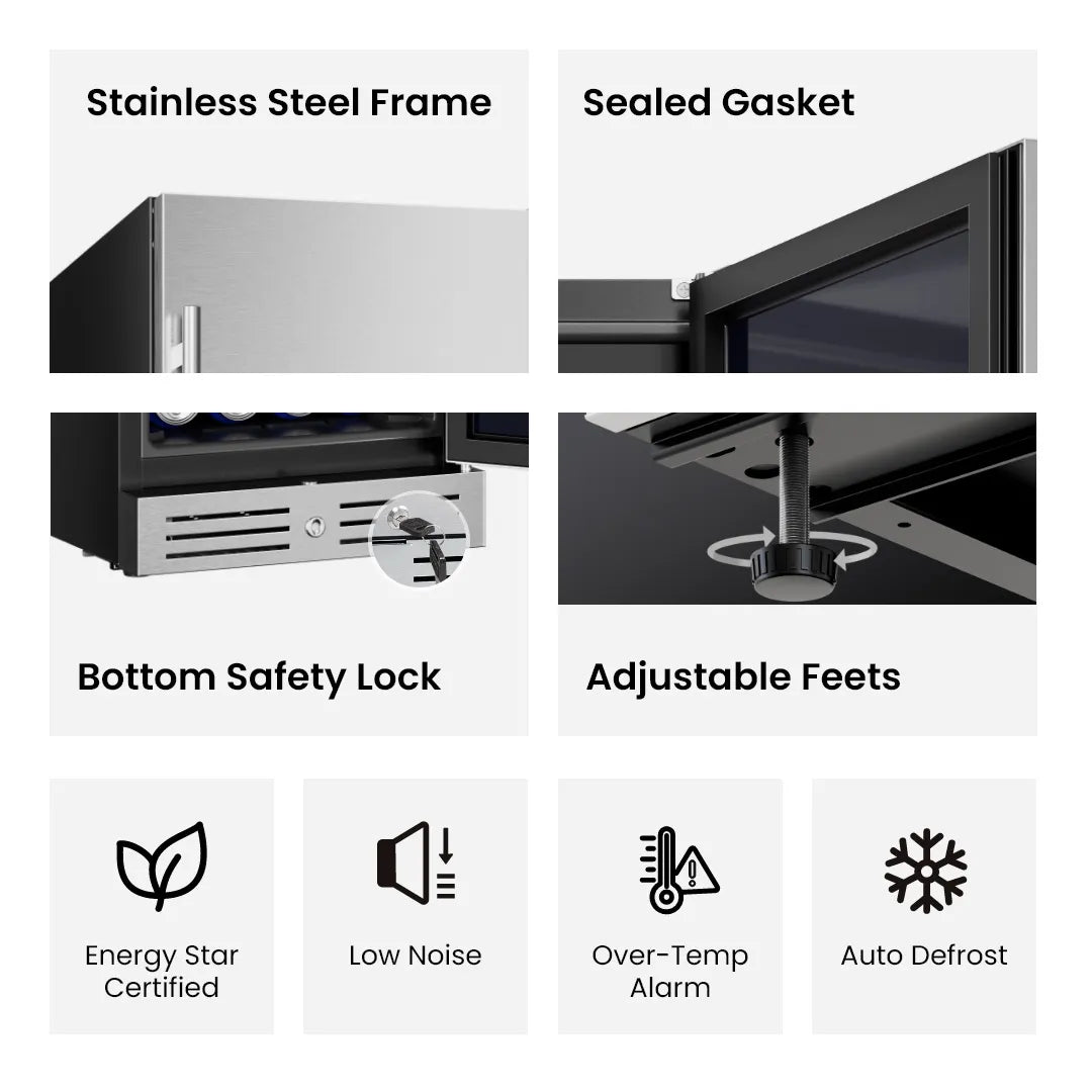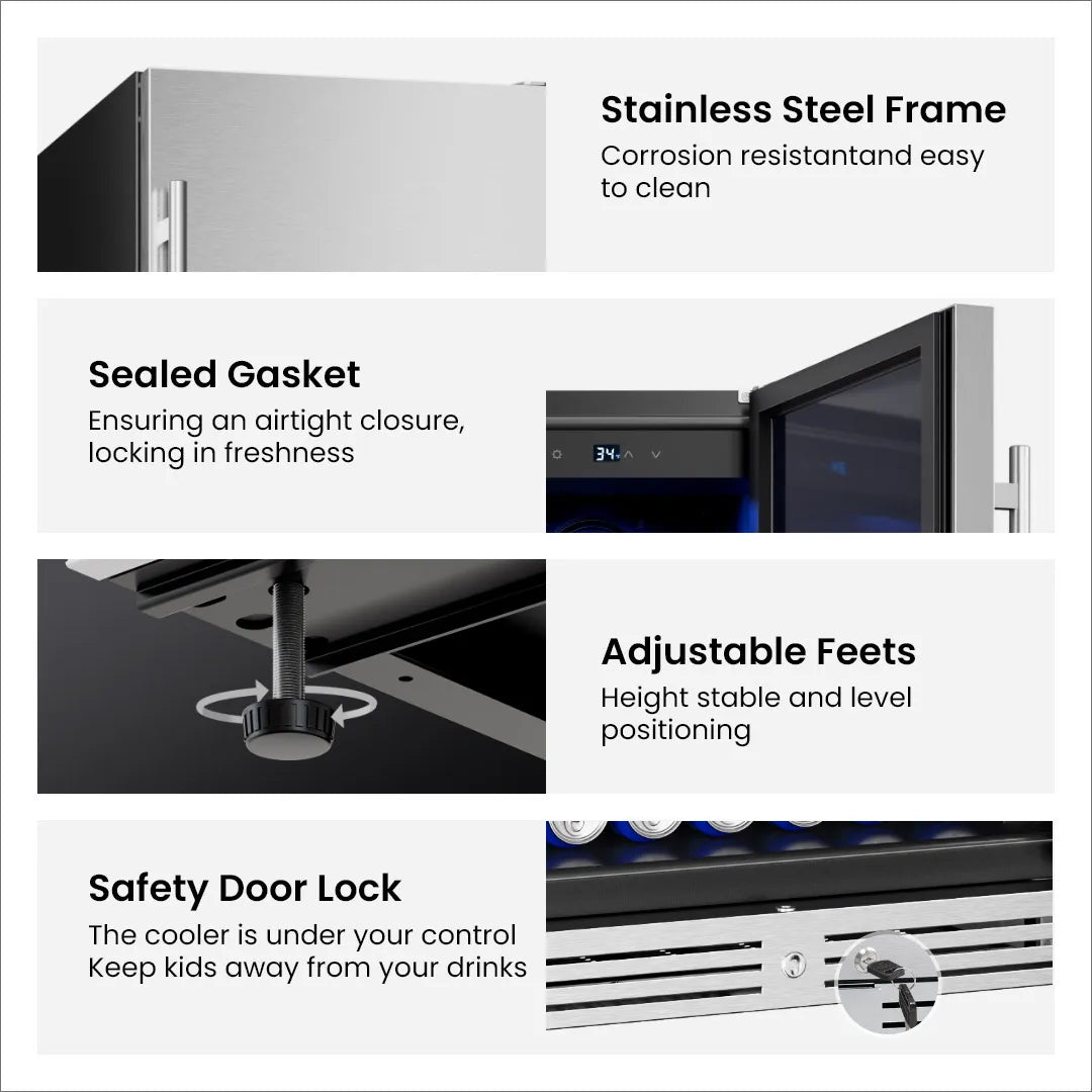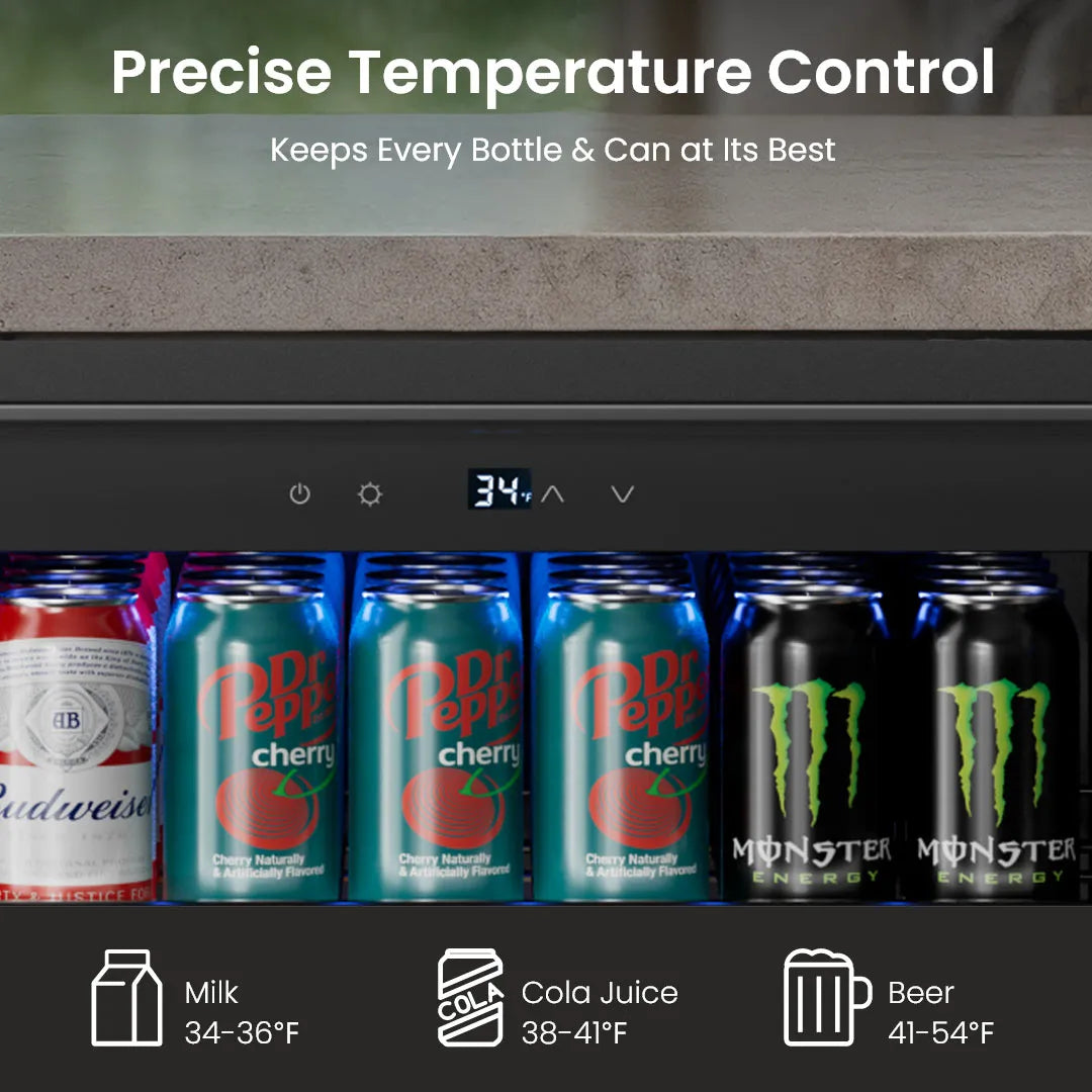 The upgraded compressor system provides fast and steady cooling between 34°F–54°F, even on hot summer days. It maintains a consistent temperature to keep your drinks perfectly chilled.